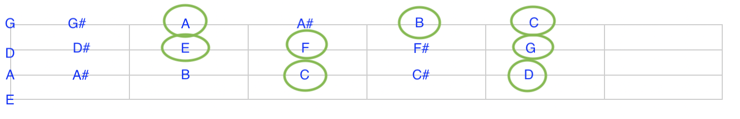 The A major scale uses the same shape but starts on the E string, 5th Fret.