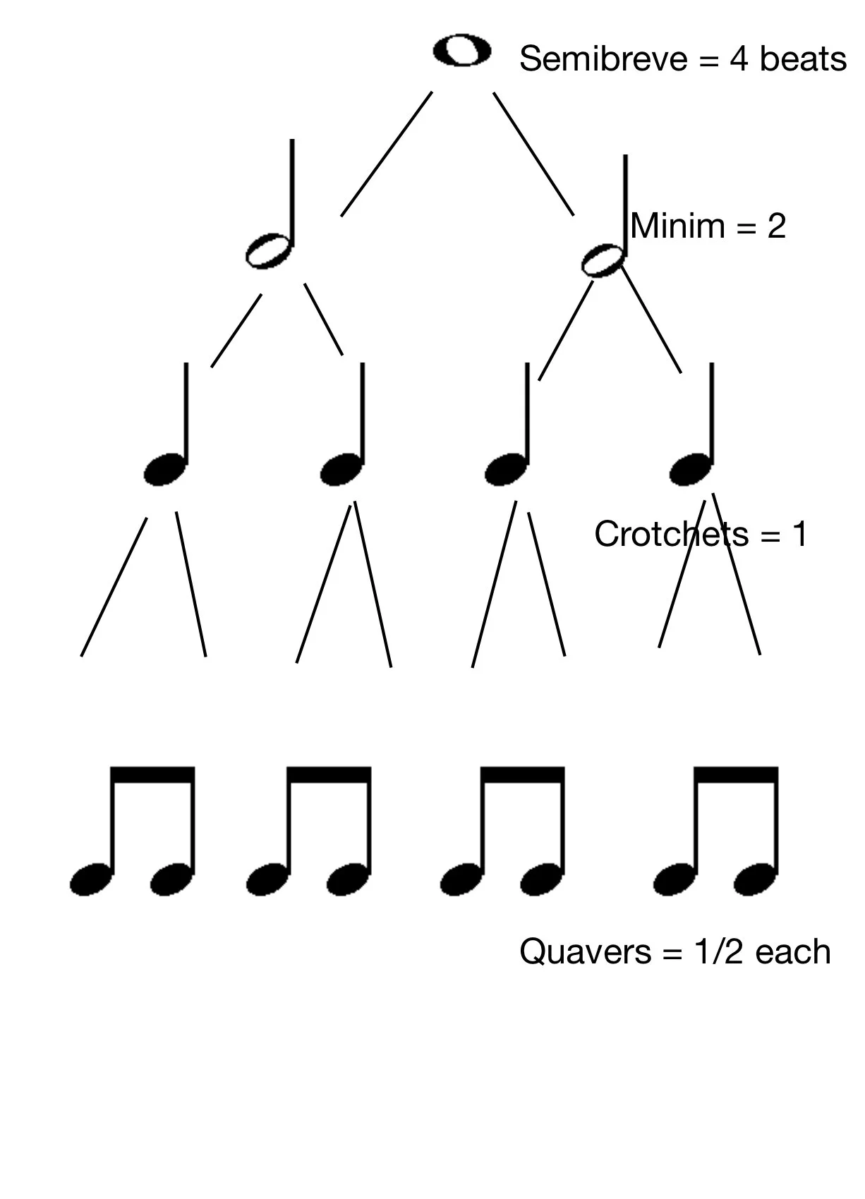 To get started you need some understanding of note values. Outlined below are the basic note values - Semibreves, Minims, Crotchets and Quavers.